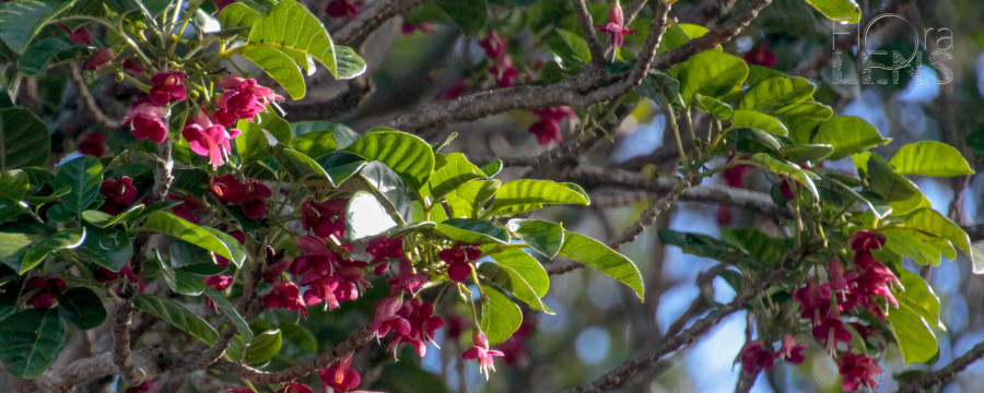 Growing to 20m high, and forming a large dome-shaped tree. Leaves are glossy and hand-shaped, made of 5 large, furrowed leaflets. Flowers are dark-pink and tubular, and the resulting pink-red berries are round.