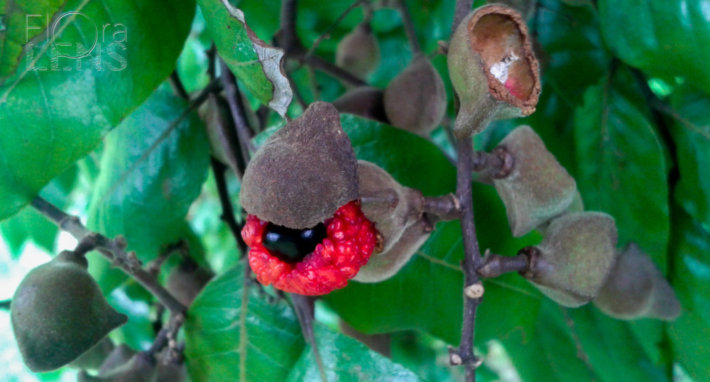 Grows to 3-5m high after 10 years, with a rounded head. Shiny black seeds peer out from the bright red fleshy fruit, but trees don’t fruit consistently every year. The tree is easily recognised by its glossy leaves made up of 3-7 pointed leaflets. Trees often form a lattice of roots above the soil close to the trunk (see image)